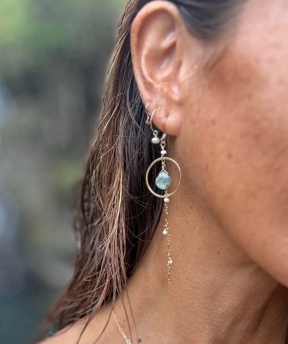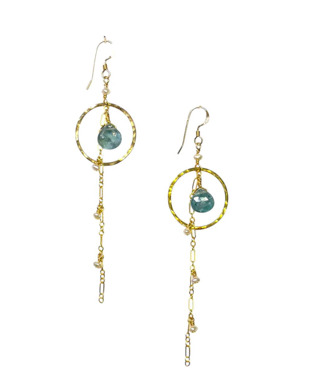 Beautifully paired, stunning drops of Kyanite encircled by hammered hoops delicately dripping with tiny freshwater pearls on our fancy chain